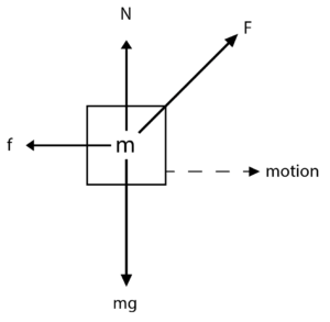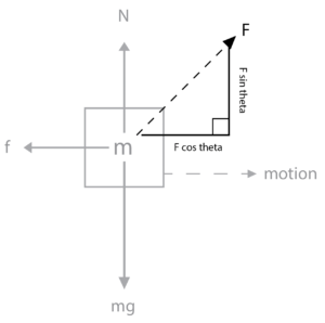 This can be written as F cosθ – μ(N) since frictional force is calculated by multiplying the normal force with the coefficient of kinetic friction.