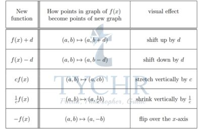 Suppose you know what the graph of a function f(x) looks like. Suppose d R is some number that is greater than 0, and you are asked to graph the function f(x) + d. The graph of the new function is easy to describe: just take every point in the graph of f(x), and move it up a distance of d. That is, if (a, b) is a point in the graph of f(x), then (a, b + d) is a point in the graph of f(x) + d. As an explanation for what’s written above: If (a, b) is a point in the graph of f(x), then that means f(a) = b. Hence, f(a) + d = b + d, which is to say that (a, b + d) is a point in the graph of f(x) + d.