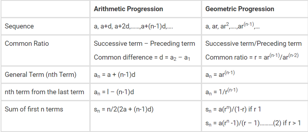 Sn = (n( a1 + an)) / 2 or Sn = (n(2a1 + (n – 1)d) / 2