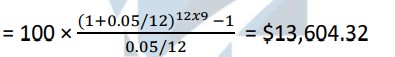 Example 1: Jolene deposits $100 every month into an annuity at 5% compounded monthly, for 9 years. Find the future value and the interest her account earned.