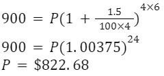 Ex. Oliver’s savings account now has a balance of $900. If the interest rate was 1.5% per annum compounded quarterly, how much did Oliver originally deposit six years ago if he has not withdrawn or deposited any money since?