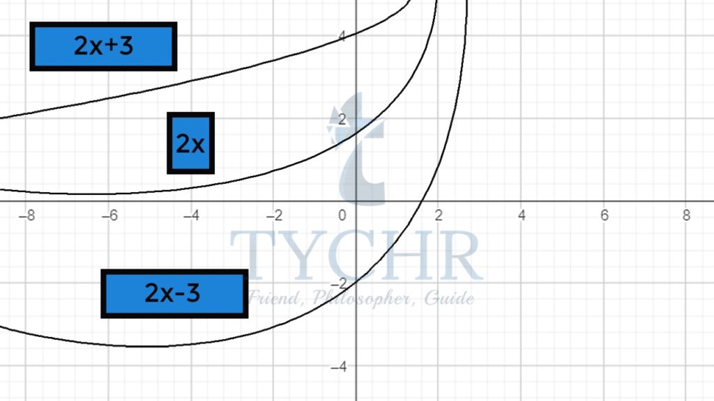 The graph of 2x moves three units vertically up when 3 is added and moves three units vertically down when 3 is subtracted.