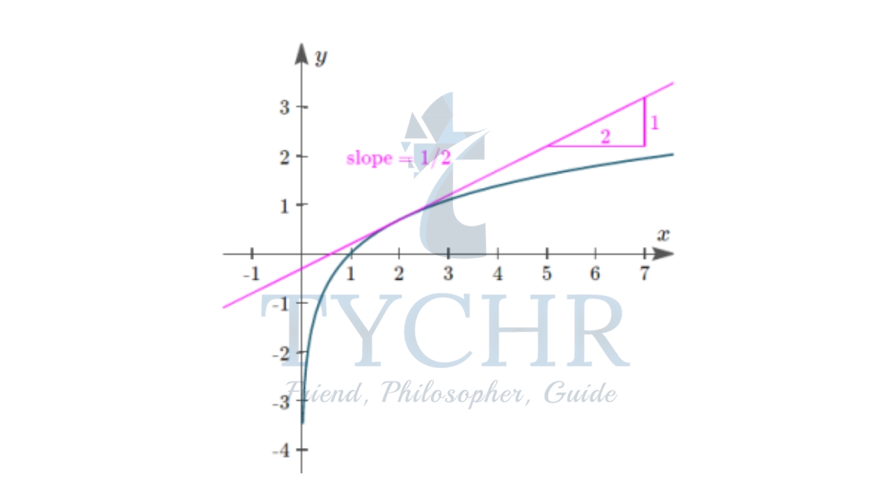 The slope of the tangent of y=ln x at x=2 is ½ . (We can observe this from the graph, by looking at the ratio rise/run)
