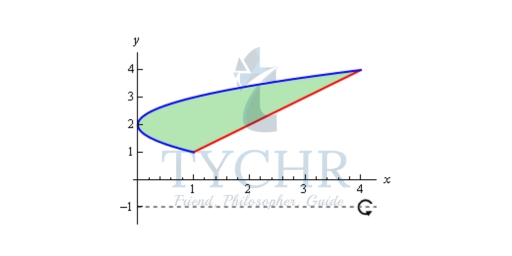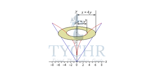 So, the two curves will intersect at y = 1 and y = 4. Here is a sketch of the bounded region and the solid.