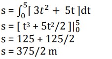 Example: The velocity of a particle is modelled by v(t) = 3t2 + 5t, where t is measured in seconds. Find the displacement of the particle after 5 seconds.