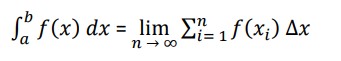 Given a function f(x) that is continuous on the interval [a,b] we divide the interval into n sub-intervals of equal width, Δx, and from each interval choose a point, xi. Then the definite integral of f(x) from a to b is: