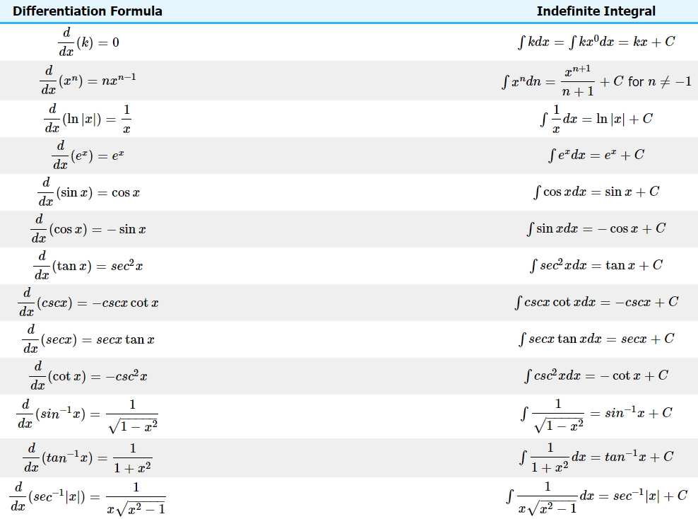 Here is a table showing some integrals of common functions as anti-derivatives: