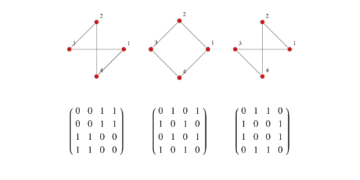 For a graph with |V| vertices, an adjacency matrix is a ∣V∣×∣V∣ matrix of 0s and 1s, where the entry in row i and column j is 1 if and only if the edge (i, j) is in the graph. If you want to indicate an edge weight, put it in the row i, column j entry, and reserve a special value (perhaps null) to indicate an absent edge. Here’s the adjacency matrix for the social network graph: