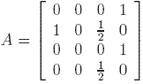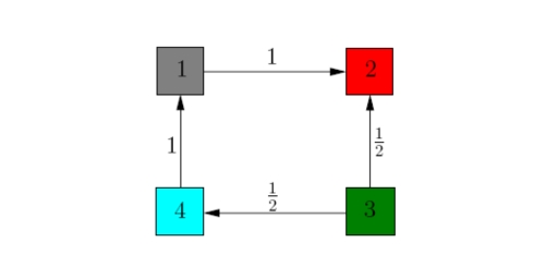 The transition matrix A associated to a directed graph is defined as follows. If there is an edge from i to j and the outdegree of vertex i is di, then on column i and row j we put 1/di. Otherwise we mark column i, row j with zero. Notice that we first look at the column, then at the row. We usually write 1/di on the edge going from vertex i to an adjacent vertex j, thus obtaining a weighted graph.
