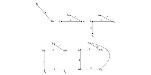 In Kruskal’s algorithm, at each iteration we will select the edge with the lowest weight. So, we will start with the lowest weighted edge first i.e., the edges with weight 1. After that we will select the second lowest weighted edge i.e., edge with weight 2. Notice these two edges are totally disjoint. Now, the next edge will be the third lowest weighted edge i.e., edge with weight 3, which connects the two disjoint pieces of the graph. Now, we are not allowed to pick the edge with weight 4, that will create a cycle and we can’t have any cycles. So, we will select the fifth lowest weighted edge i.e., edge with weight 5. Now the other two edges will create cycles so we will ignore them. In the end, we end up with a minimum spanning tree with total cost 11 (1 + 2 + 3 + 5).