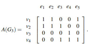 Let G be a graph with n vertices, m edges and without self-loops. The incidence matrix A of G is an n × m matrix A = [aij] whose n rows correspond to the n vertices and the m columns correspond to m edges such that: