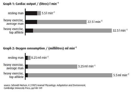 (ii) Calculate the increase in total oxygen consumption (ml min−1) for a top athlete during heavy exercise as compared to a resting man.