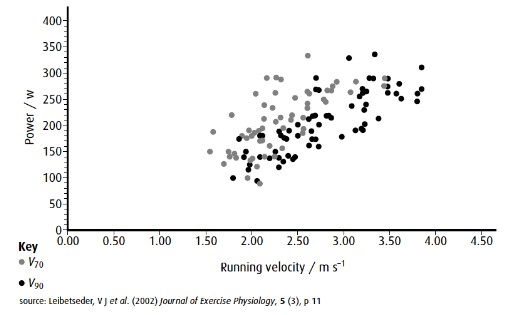 B. Outline the relationship between running velocity and power developed at V90.