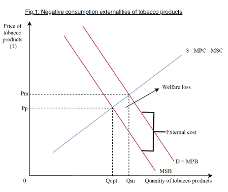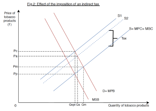 In Fig.1, the additional benefit incurred by the Indian consumers from consuming an extra tobacco product, Marginal Private Benefit (MPB), is greater than the additional benefits to society, Marginal Social Benefit (MSB). The demand curve depicts the MSB accrued to society, and MPB, whereas the supply curve represents the Marginal Social Cost (MSC), which includes the existing tax.