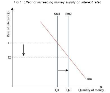 As seen in Fig.1, the reduction in interest rates from I1 to I2 does not occur on its own, but is a response from increasing the money supply from S1 to S2. As this supply rises, the demand for money (Dm) expands, reducing the cost of borrowing.