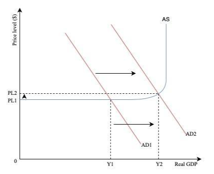 Keynes, a British economist, argued that AD is the primary driving force in an economy for which prices and wages are inflexible. In the Keynesian model, an increase in AD leads to a higher real GDP. However, this only occurs while spare capacity is prevalent, as represented by the horizontal region of the Aggregate Supply (AS) curve. Once the spare capacity is exhausted, the firm is forced to produce at a higher price level. Hence it is efficient to produce at the full employment level of output (Y2), resulting in economic growth.