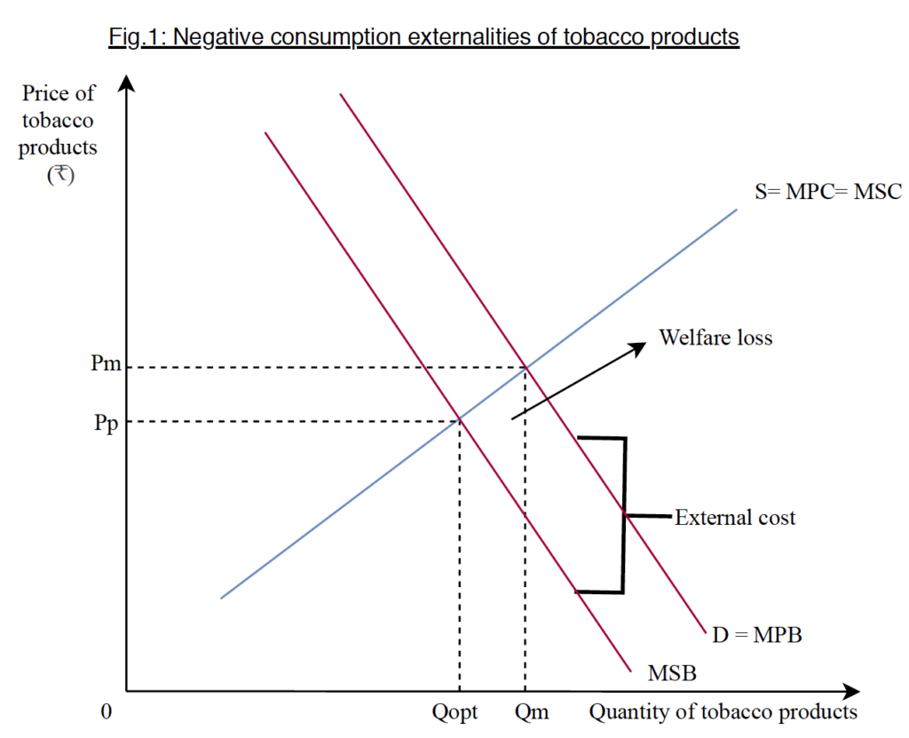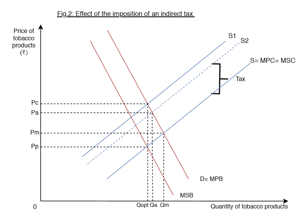 In Fig.1, the additional benefit incurred by the Indian consumers from consuming an extra tobacco product, Marginal Private Benefit (MPB), is greater than the additional benefits to society, Marginal Social Benefit (MSB). The demand curve depicts the MSB accrued to society, and MPB, whereas the supply curve represents the Marginal Social Cost (MSC), which includes the existing tax.