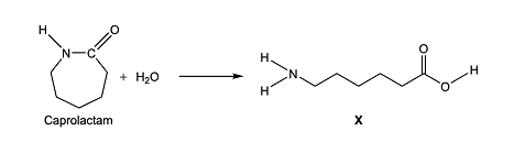 c.) Caprolactam reacts with water to form a compound X, a monomer.