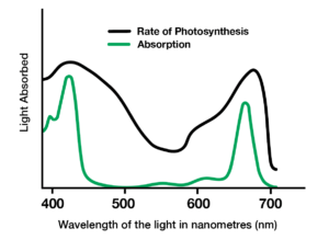 b.) Using a graph of an absorption spectrum, explain the relationship between light wavelength and the rate of photosynthesis.