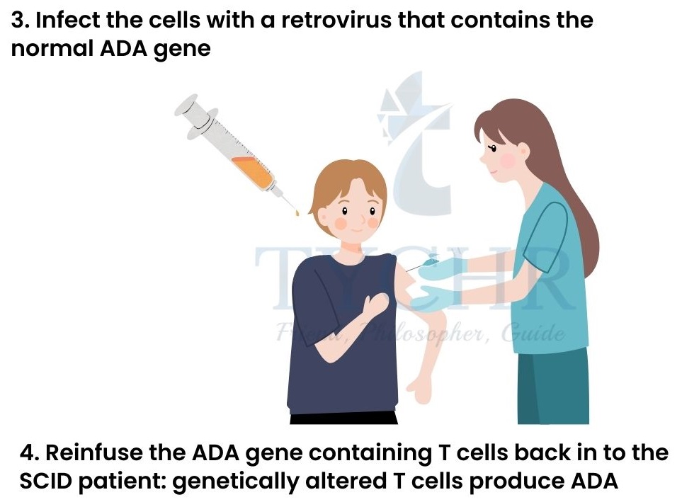 Treatment of SCID using gene therapy SCID – Severe Combined Immunodeficiency Patients with SCID lack a functional immune system. They seemed to have altered the ADA gene which produces an enzyme adenosine deaminase. This enzyme is responsible for immune response. This is how a gene therapy was performed to cure: Removal of the defected lymphocytes and then culture it with the retroviral cells containing normal ADA producing gene. The normal gene is then incorporates into the cells and they are then reintroduced.