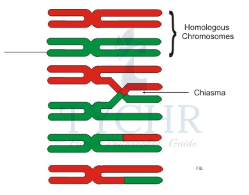 - Chiasma forms while crossing over. It is a point of adherence of two non-sister chromatids for efficient exchange of genetic material. The chromosomes fall apart eventually but chiasma sites restrict it from parting, therefore the smaller portion of the chromosomes gets crossed.