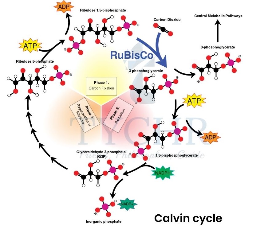 - Now some of the triose phosphate molecules leave the cycle but some continue it to regain RuBP molecules (using ATP).