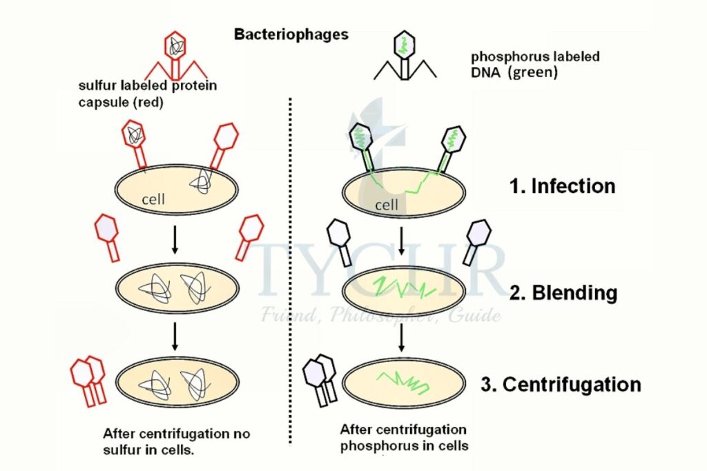 - Bacteria infected with the viruses having 32P found to have radioactive DNA and bacteria infected by 35S do not have radioactive DNA. This indicates that DNA gets transferred from virus to bacteria as the genetic material.
