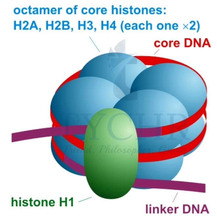 - → A nucleosome consists of 2 units of each of four different histone proteins (H2A, H2B, H3, H4) forming a histone octamer and a 200 bp of DNA helix, wrapped. An additional histone protein named H1 is present to further packaging the whole structure.