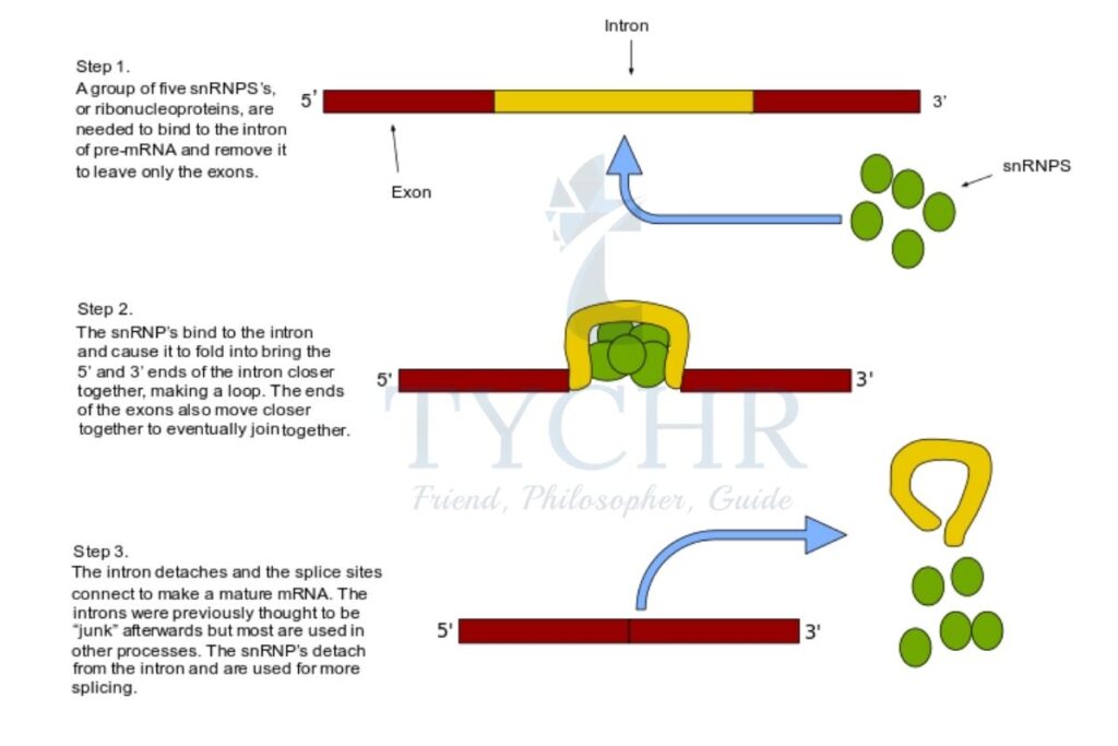 from the pre-mRNA, so that only exons remain. - Spliceosomes are used which contains snRNAs (small nuclear RNAs or snurps), which remove the introns and a poly-A tail (50-250 adenine nucleotides) is joined at 3’ end and capping of methyl guanosine triphosphate is done at 5’ end.