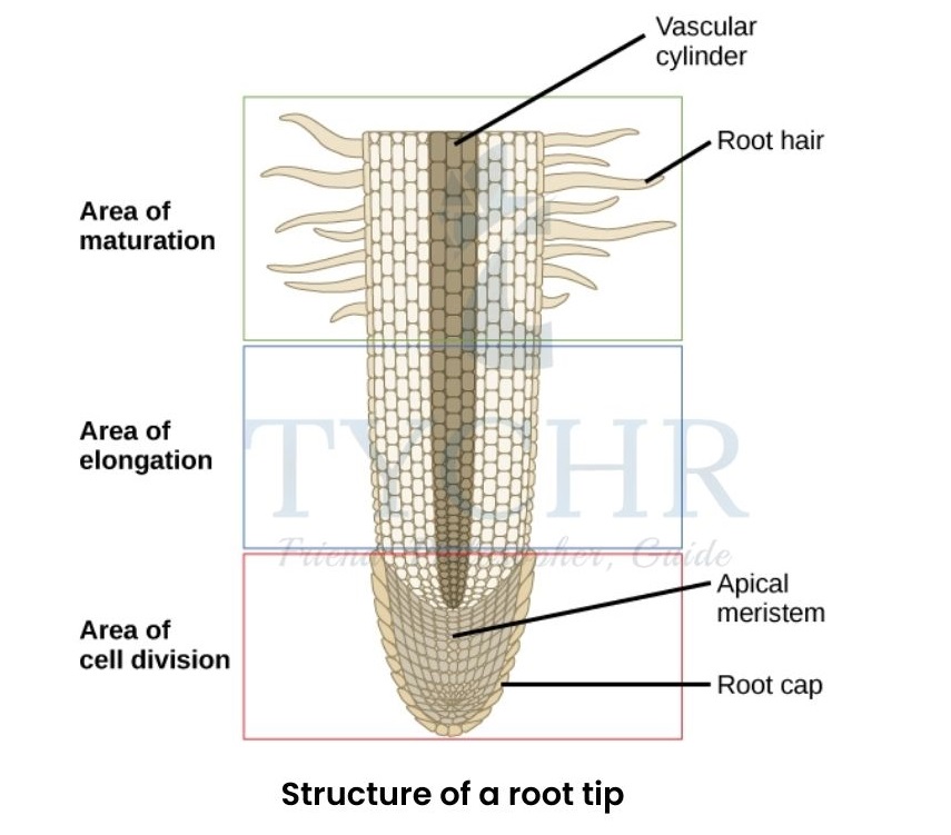 Figure 9.3 Structure of a root tip - Roots absorb water and mineral ions necessary for plant growth which can be done passively, actively or by the action of fungal hyphae.