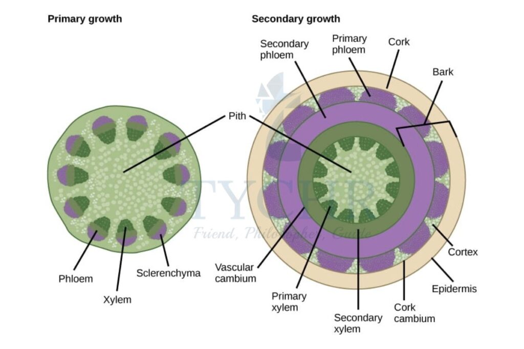 - Vascular cambium, it produces secondary xylem on its inner side and secondary phloem on its outer side and is present in between the both.