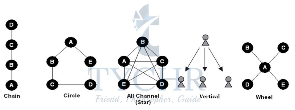 We will now discuss the different types of formal communication networks. The communication network is the official channel or route of communication in an organization.