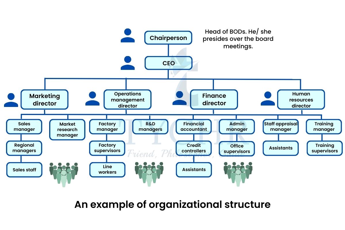 Organizational structure is the formal framework within a business organization which identifies the roles/ job functions of different people in an organization, their responsibilities, the system of flow of information across different levels, and the way in which authority is passed down the organization through the chain of command.