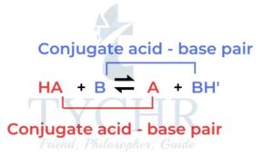 - In other words acid HA has reacted to form the base A–, while base B has reacted to form acid BH+.