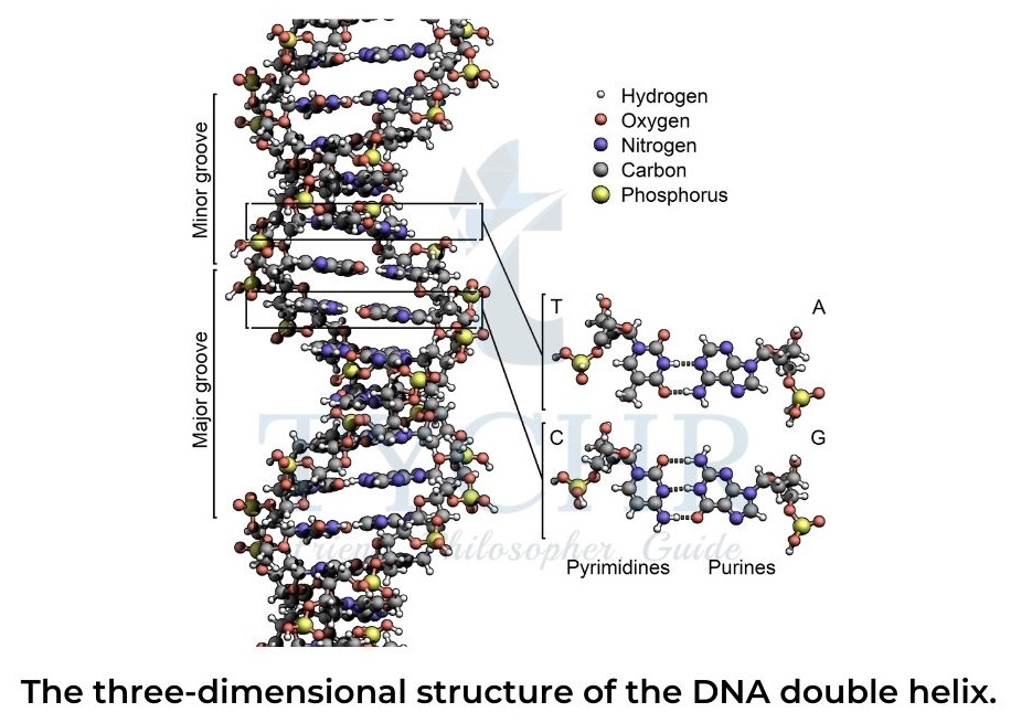 - Each pair contains one purine base (A or G) and one pyrimidine base (T or C, respectively).