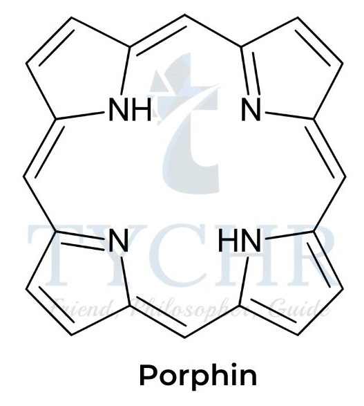 - The organic backbone of porphyrins, known as porphin, contains four nitrogen atoms in a highly conjugated aromatic heterocycle.