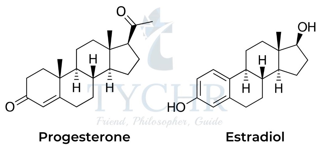 - Estradiol and progesterone are responsible for controlling sexual development and menstrual and reproductive cycles in women. Estradiol is one of the few steroids that contains an aromatic ring in the steroidal backbone.