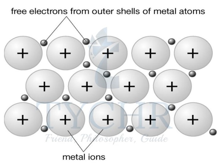 Figure 15: A model of metallic bonding. It is often described as a lattice of cations surrounded by a sea of electrons - the number of delocalized electrons;