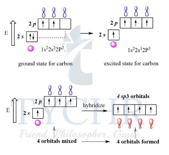 - When carbon forms four single bonds, it undergoes sp3 hybridization, producing four equal orbitals.