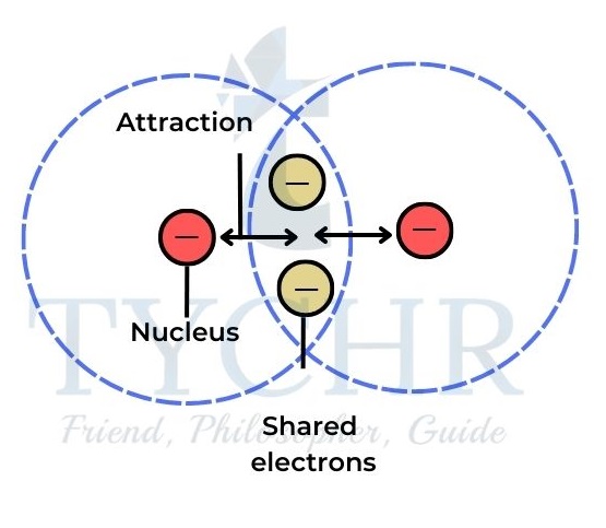 - The shared pair of electrons is concentrated in the region between the two nuclei and is attracted to them both. It therefore holds the atoms together by electrostatic attraction and is known as a covalent bond.