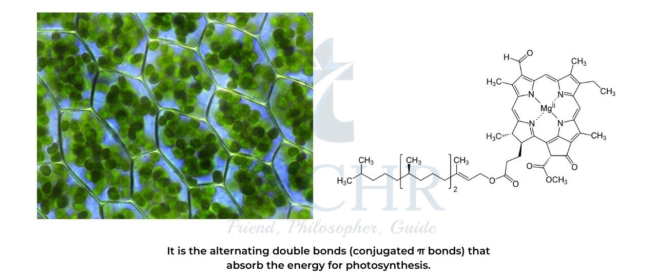 - Visible light can be absorbed by molecules that have a conjugated structure with an extended system of alternating single and multiple bonds. These alternating bonds in chlorophyll can absorb light energy.