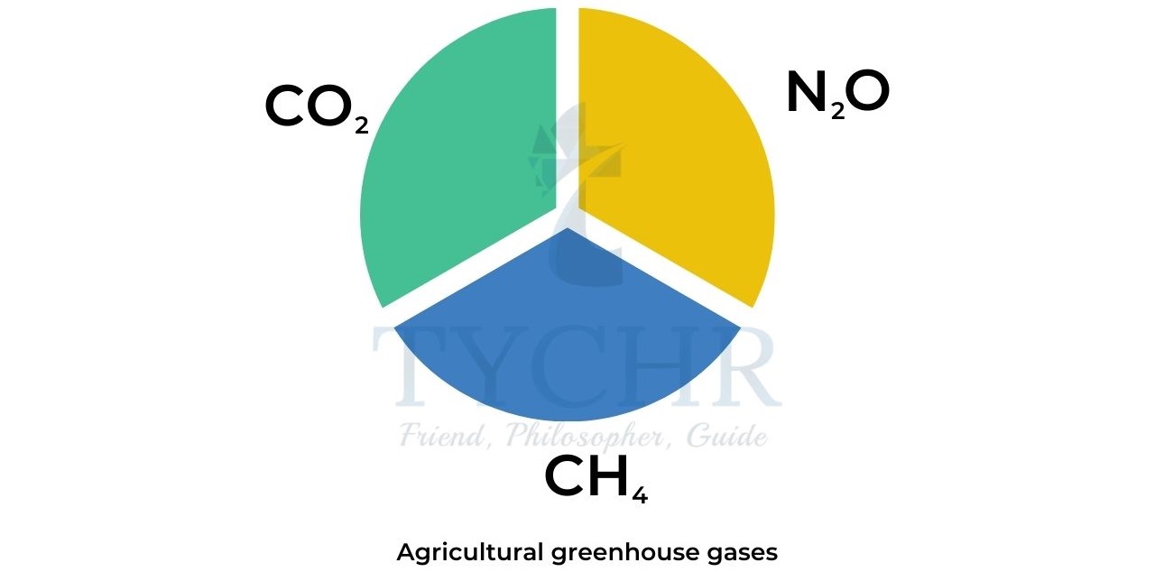 - Methane, CH4 and nitrous oxide, N2O are the main greenhouse gases produced in agriculture. Although these two gases are produced in smaller quantities than carbon dioxide they still have a pronounced effect.