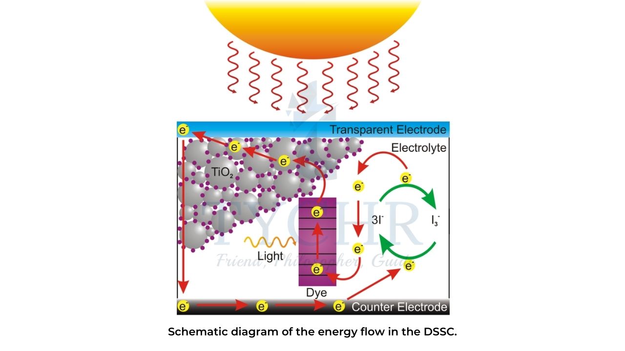 - The iodide ions release electrons to the dye on the TiO2 layer, becoming oxidized to tri-iodide I3–.
