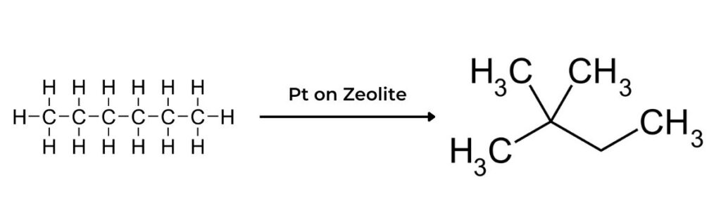 - The straight-chain alkanes are isomerized by heating with a platinum catalyst. Their chains break apart and reform, increasing the proportion of branched alkanes.