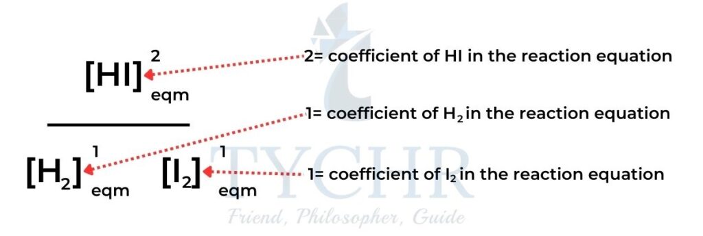 - Each concentration is raised to the power of its coefficient in the balanced equation.