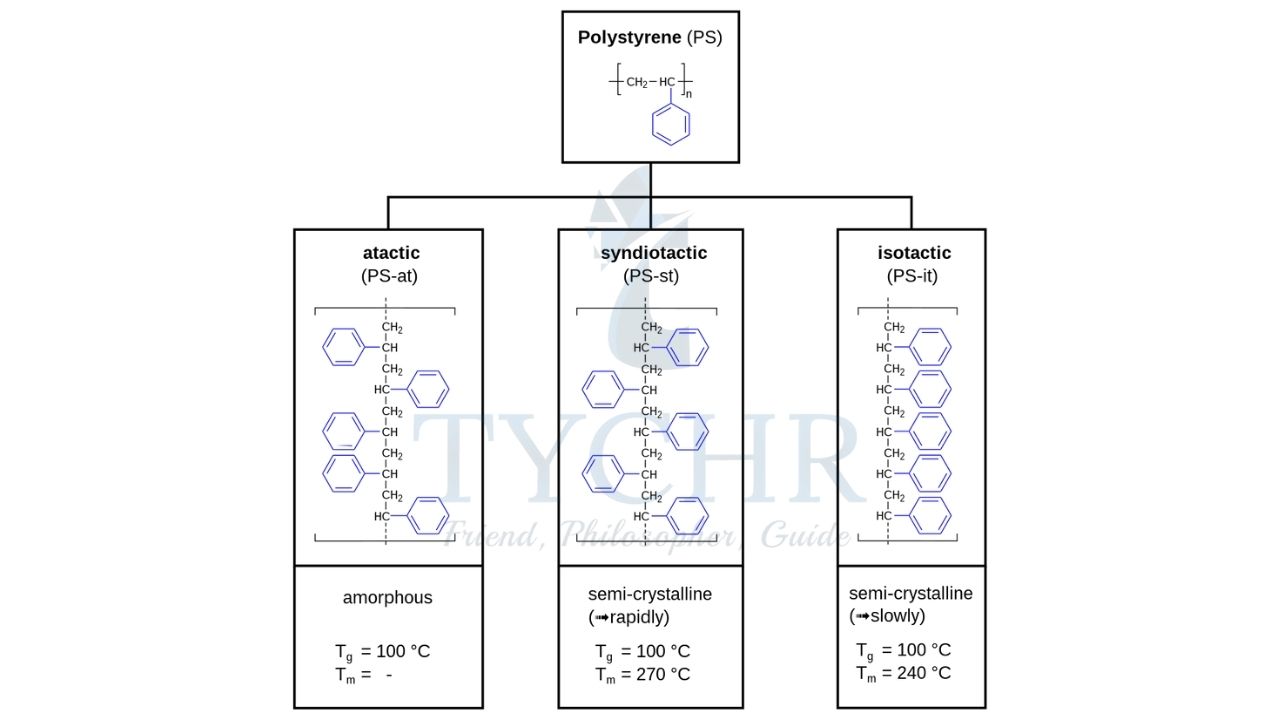 Side groups on monomers | Hydrogen bonding can increase strength, e.g. Kevlar. Atactic and isotactic placement can influence strength, e.g. polystyrene | Polystyrene |