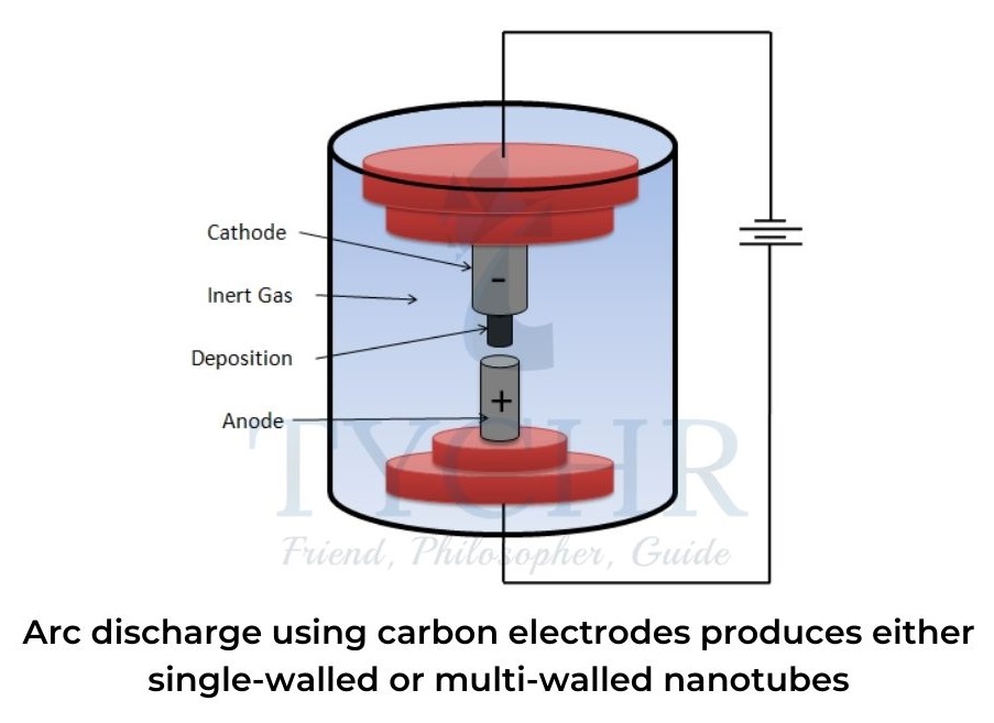 - Two carbon rods are placed about 1 mm apart in a container of inert gas (helium or argon) at low pressure.Between the two electrodes, a direct current causes a high-temperature discharge that vaporizes a portion of one carbon anode and forms a small rod-shaped deposit on the other.