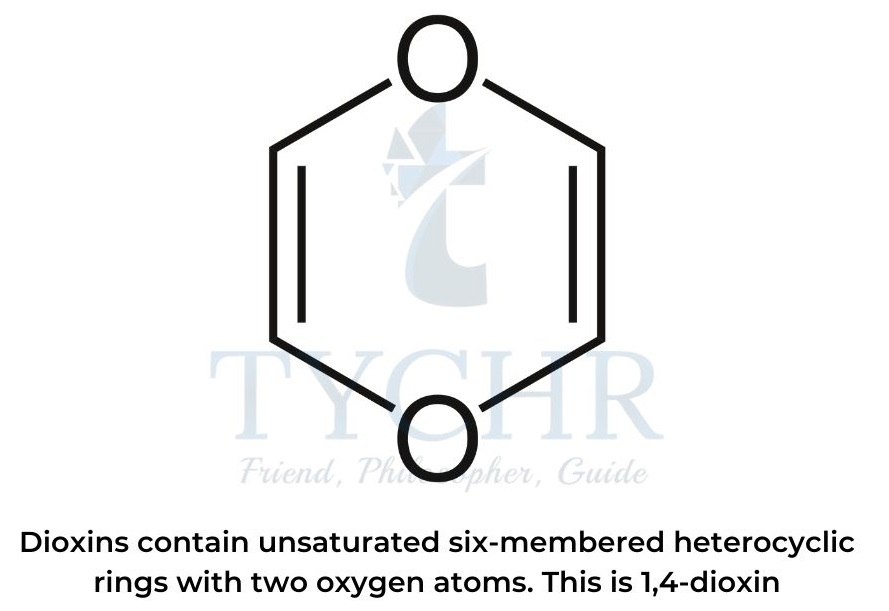 - Dioxin molecules contain unsaturated six-membered heterocyclic rings with two oxygen atoms, usually in positions 1 and 4.