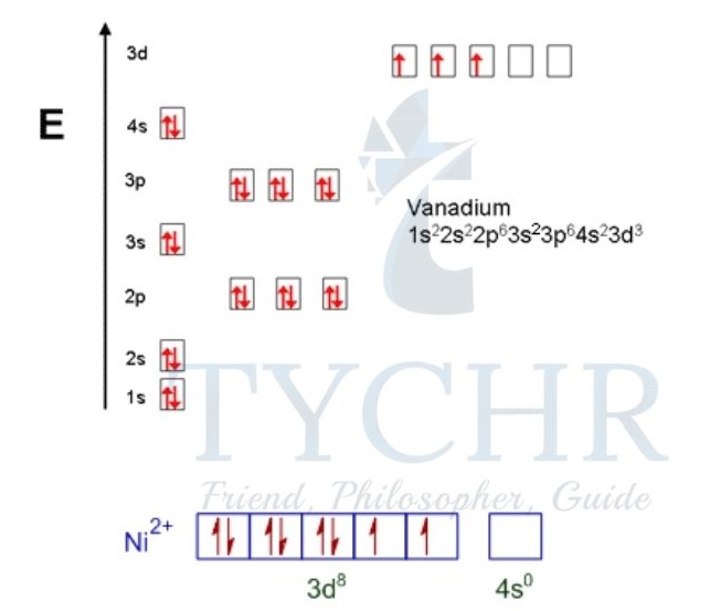 - For Ni2+ (Z = 28): 1s22s22p63s23p63d8 (full electron configuration) [Ar]3d8 (condensed electron configuration) The orbital diagram is: