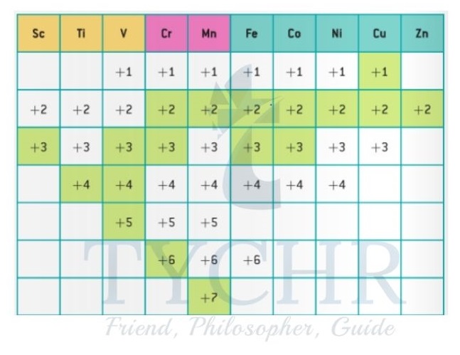 Figure 11: Range of oxidation states of the first-row d-block metals. The most common oxidation states are marked in green.